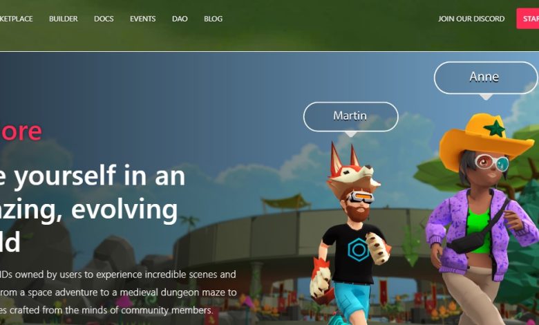- Pergi ke situs resmi Decentraland*org (ganti bintang dengan titik), lalu klik tombol Start Exploring di pojok kanan atas.
